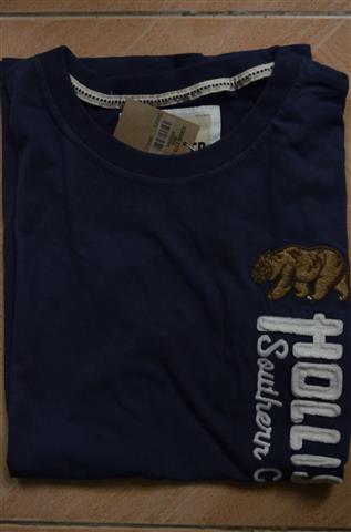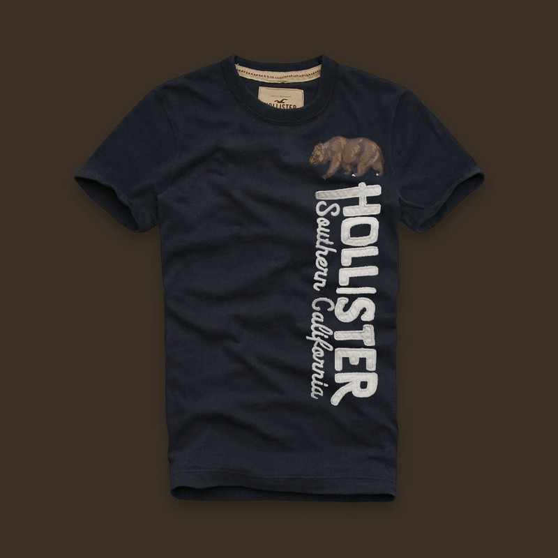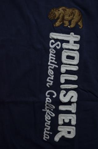 - Họa tiết logo con gấu và dòng chữ Hollister in dọc thân áo.