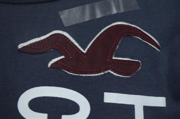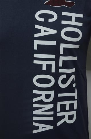 - Họa tiết logo chim én đỏ trên ngực áo và dòng chữ Hollister in dọc thân áo.