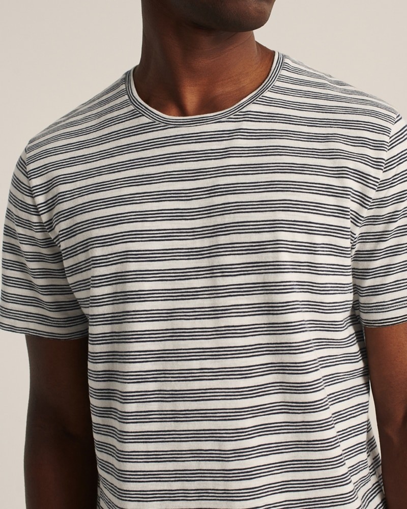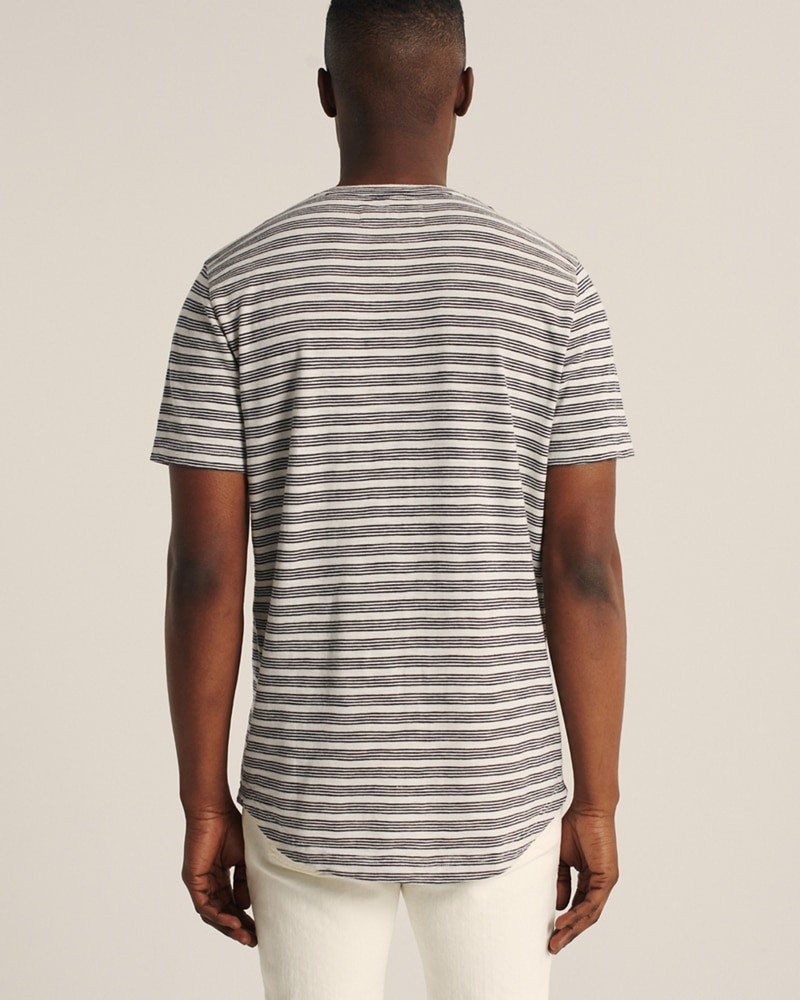 Áo thun nam Abercrombie & Fitch AF-T282 Curved Hem Pattern Tee là áo thun abercrombie & fitch nam cổ tròn tay ngắn màu kem sọc ngang đen, vạt lai bầu. Chiếc áo thun nam này có chất vải Body:100% Cotton thoáng mát, tạo cảm giác thoải mái khi mặc. Chiếc áo cổ tròn này có lai bầu mang phong cách trẻ trung hiện đại. Kiểu dáng đơn giản dễ kết hợp với quần short, quần jean hoặc quần khaki. Hàng đúng của Abercrombie & Fitch Mỹ nên chất lượng cực kỳ tốt.