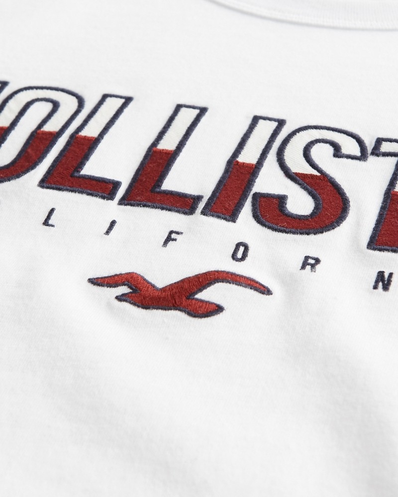 - Hoạ tiết thêu hàng chữ HOLLISTER california cùng logo chim én kết hợp hai màu trắng và đỏ rất đẹp trước ngực