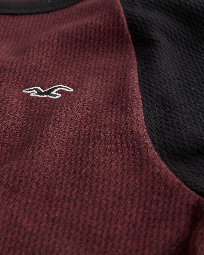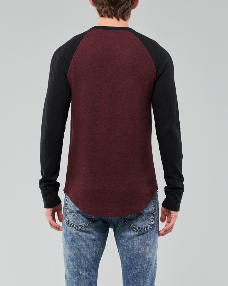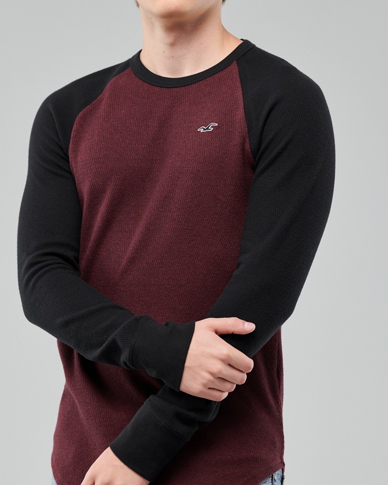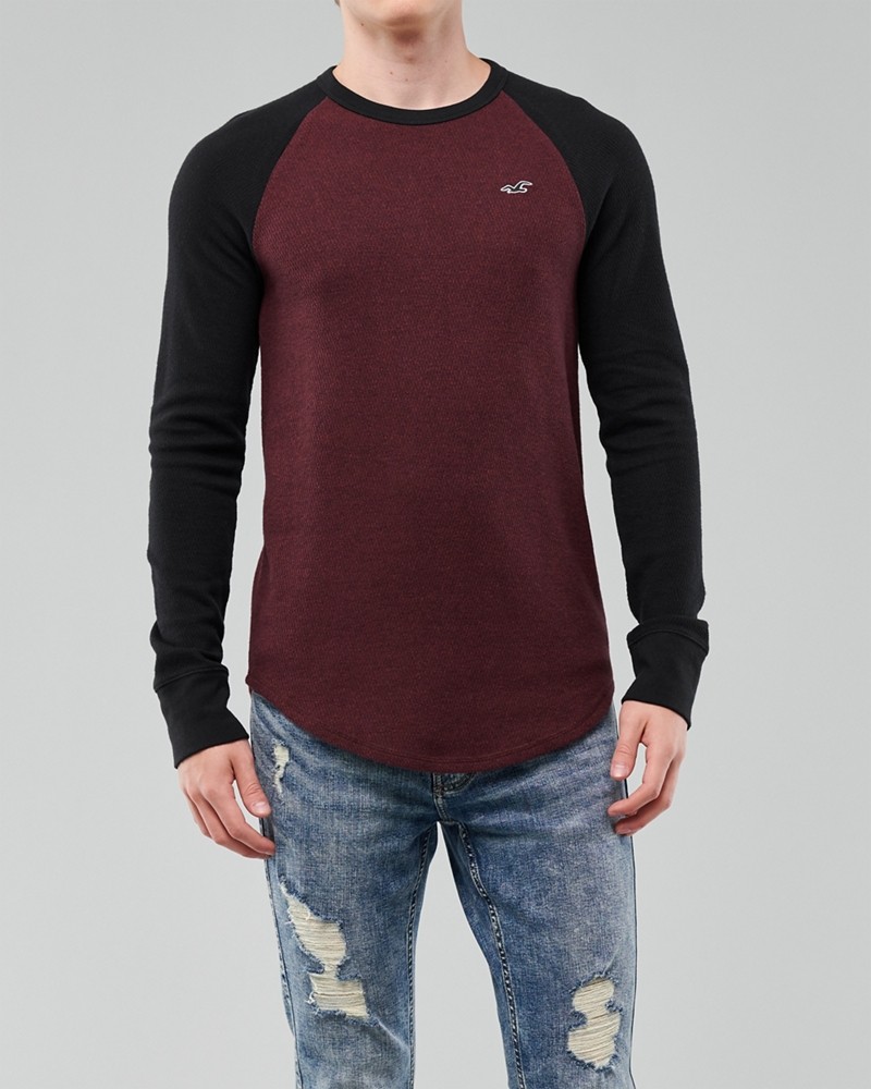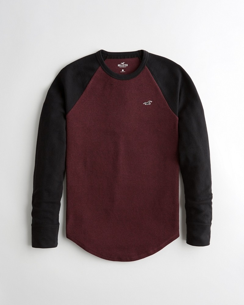 Áo thun nam tay dài Hollister HCO-HL86 Waffle Curved Hem T-Shirt Raglan Burgundy là áo thun Hollister nam dài tay có màu đỏ đô, hai tay áo màu đen nổi bật. Áo có chất vải đan xéo lạ là đặc biệt. Đây là dòng áo đặc trưng của mùa thu đông. Trên ngực áo thêu logo biểu tượng chim hải âu màu xanh đen viền trắng rất đẹp rất sắc sảo. Áo có dạng lai bầu hiện đại. Áo có chất vải 60% cotton, 40% polyester vải khá dày nhưng thấm hút mồ hôi, mang cảm giác ấm áp và nhưng vẫn thoải mái cho người mặc.