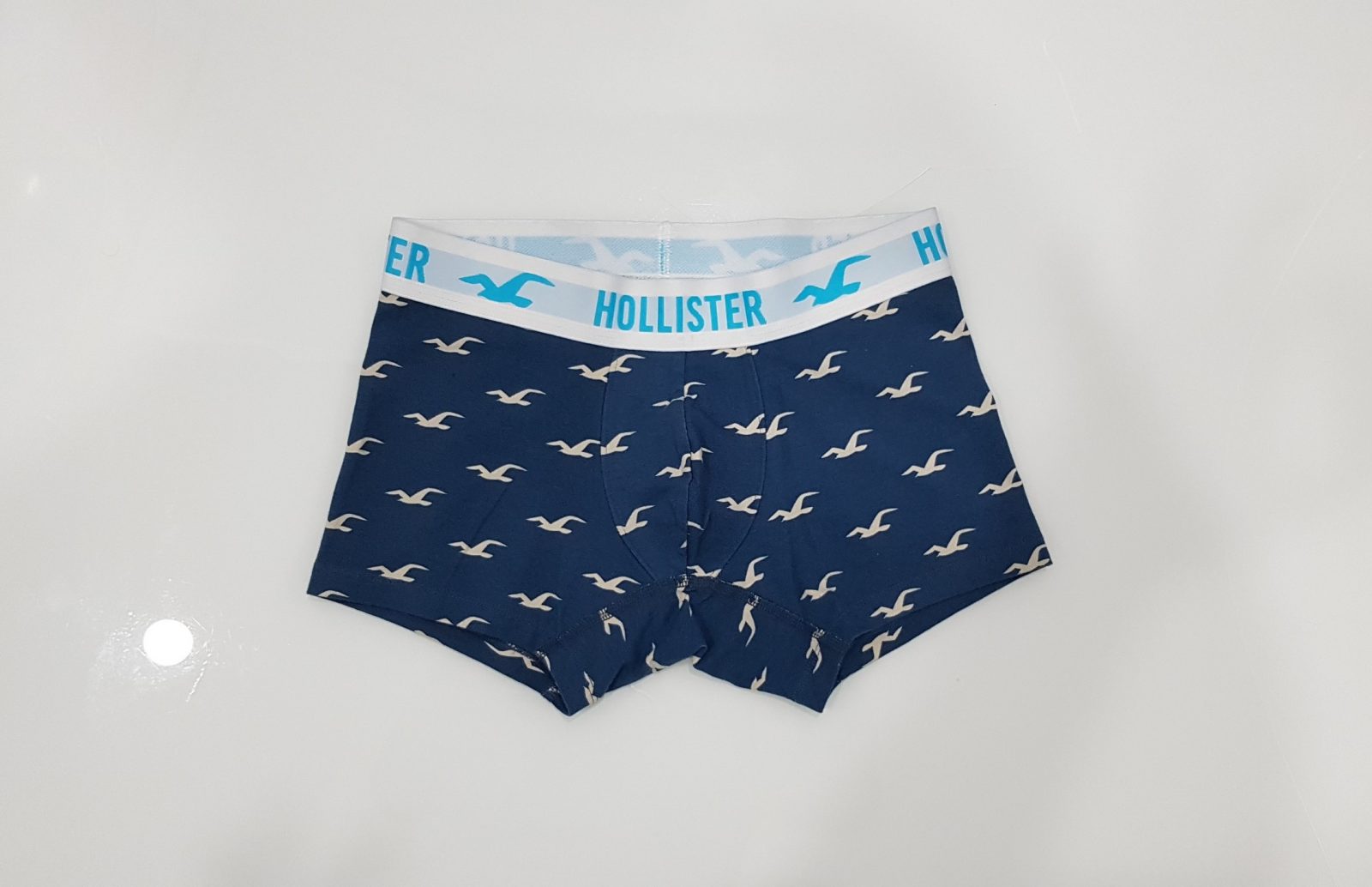 - Đai quần màu trắng và xanh nhạt nổi bật cùng hàng chữ Hollister chìm màu xanh dương.